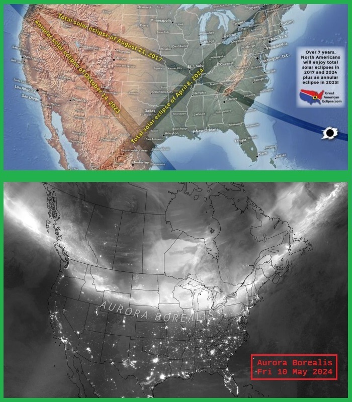Book of Revelation, Chapter 18, King James Version 1: And after these things I saw another angel come down from heaven, having great power; and the earth was lightened with his glory. ![]() On 08 Jun 1918, about the time the United States entered WWI, there was was a Solar Eclipse that passed over over the United States. There would not be another solar eclipse to pass over the contiguous United States until Mon 21 Aug 2017, a span of 99 years. Between and including the Solar Eclipse of Mon 21 Aug 2017 and the Solar Eclipse of Mon 08 Apr 2024 and including the unpredicted G5 Aurora Borealis that lightened up and defined the northern United States on Fri 10 May 2024, there were three Solar Eclipses to pass over the contiguous United States. All this in a time span of 6 years, 8 months, and 20 days; a period of just under 7 years!